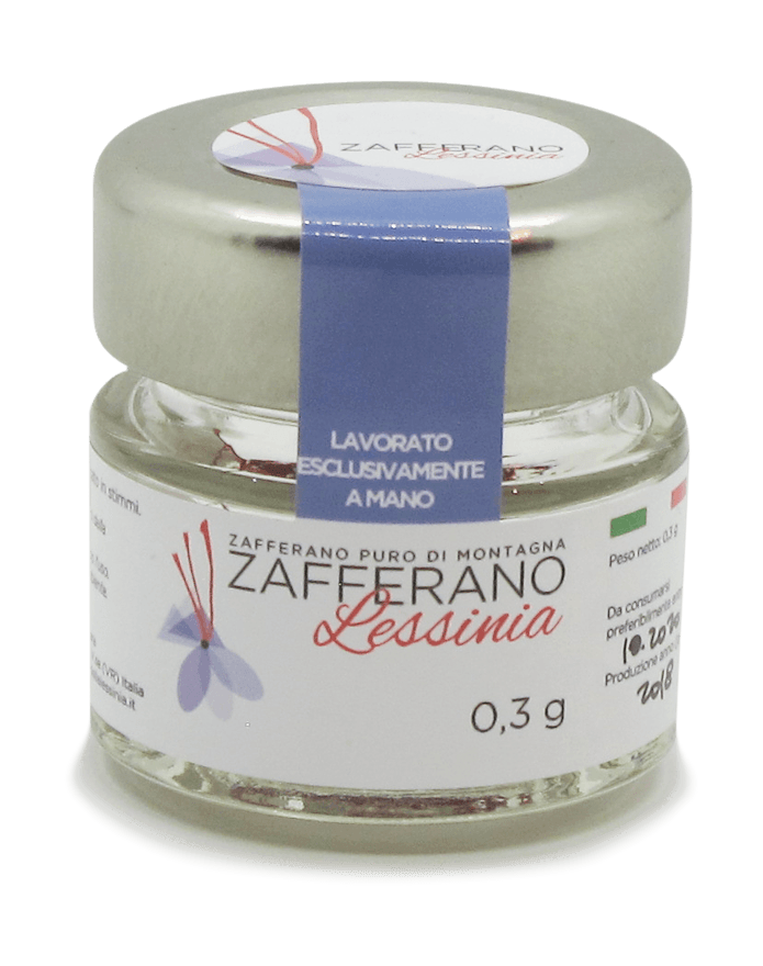 Zafferano puro di montagna essiccato in stimmi, confezionato in vasetto di vetro a chiusura ermetica.